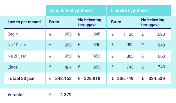 In tegenstelling tot een annuïteitenhypotheek wordt een lineaire hypotheek netto steeds iets goedkoper. De aflossing blijft gelijk, maar de rente neemt af. In de eerste jaren is de lineaire hypotheek nog duurder dan de annuïteitenvariant, maar na verloop van tijd wordt de lineaire hypotheek voordeliger.